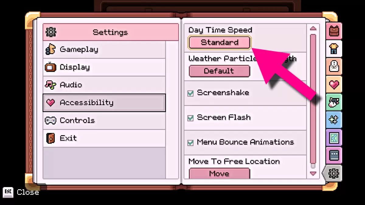 Pour démarrer, chargez votre jeu actuel Enregistrer dans le menu principal. Une fois que vous êtes de retour dans votre ferme, ouvrez le menu Pause et accédez à l'onglet des paramètres ** ** (représenté par une icône de roue de rouage) en bas. De là, sélectionnez ** 'accessibilité' ** dans le menu déroulant de gauche. Vous trouverez l'option ** 'Day Time Speed' ** en haut, initialement réglé sur «Standard».