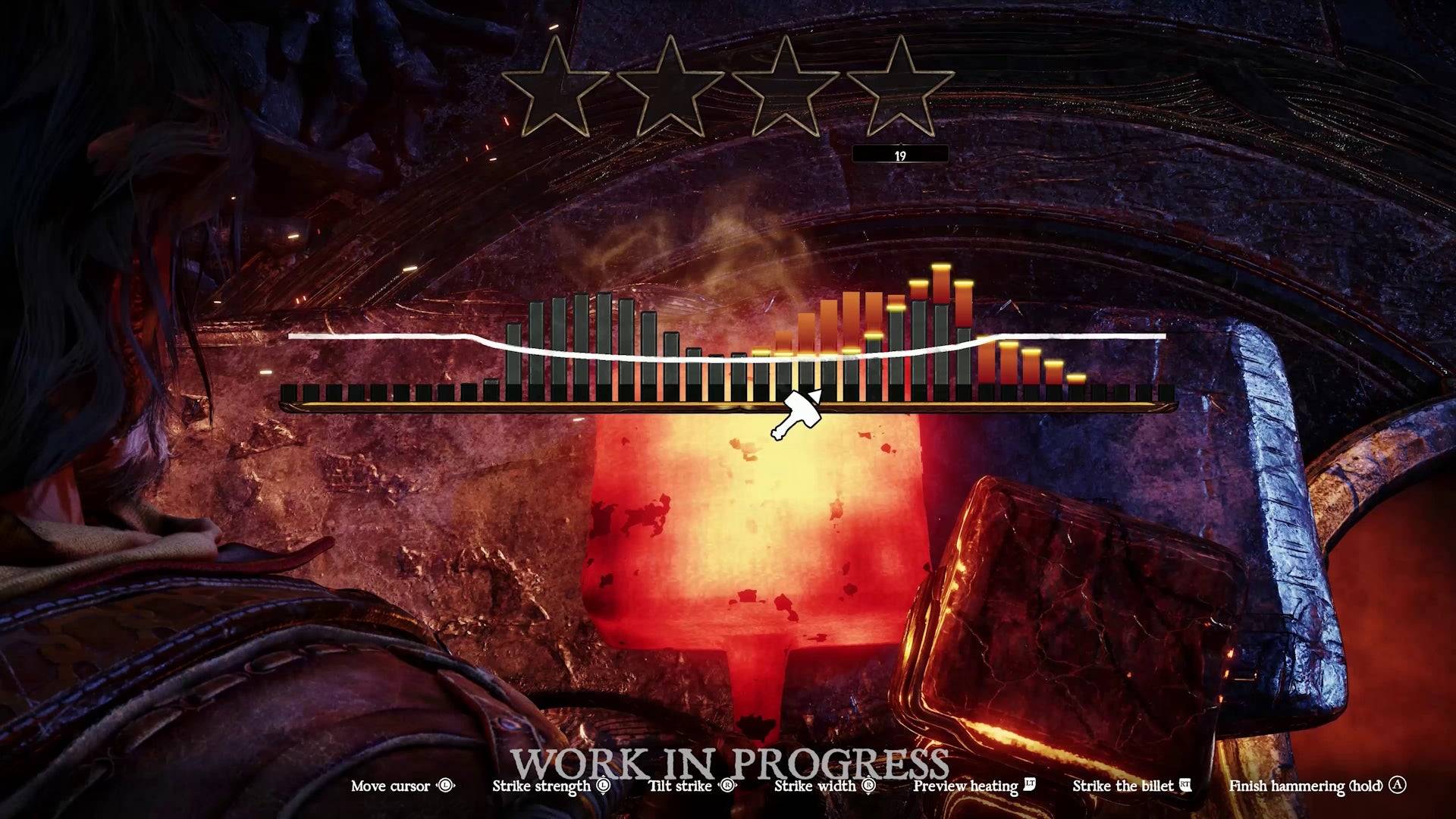 La conception des armes commence par sélectionner un modèle, puis peaufiner la longueur, la forme et les matériaux, impactant les statistiques et la consommation d'endurance. La conception est ensuite physiquement martelée sur une enclume via un mini-jeu impliquant la correspondance d'une ligne incurvée avec des frappes de marteau, visant des frappes minimales pour éviter d'affaiblir l'arme. Le résultat est une note d'étoile affectant la réparabilité.