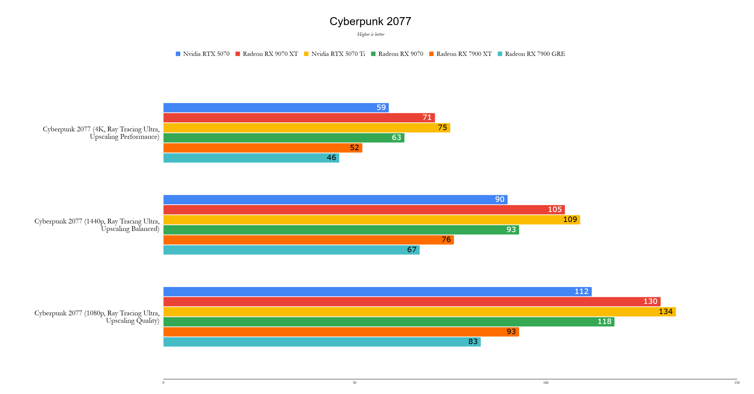 Lorsque j'ai passé en revue l'AMD Radeon RX 9070 XT, je m'attendais à ce qu'il soit à la traîne du RTX 5070 Ti, en particulier dans les jeux tracés par rayons. Étonnamment, même dans des titres exigeants comme Cyberpunk 2077, la carte AMD est restée remarquablement proche du RTX 5070 Ti, dans quelques cadres.