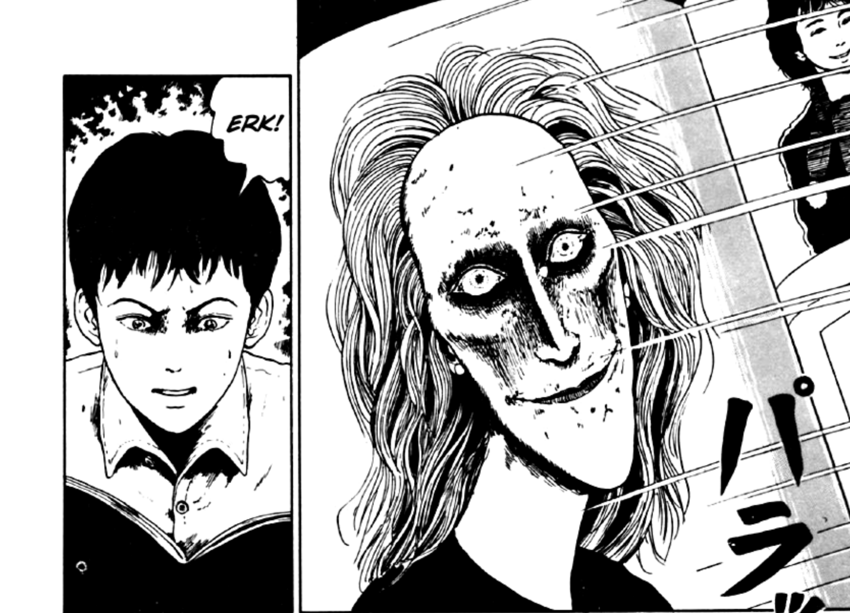Alors que de nombreuses histoires d'ITO sont des hanners à combustion lente, "Fashion Model" est une histoire d'horreur plus directe qui révèle son monstre dès le début. Comme Tomie , c'est devenu l'un des contes de longue durée les plus populaires d'ITO. Lorsqu'un jeune homme voit un modèle bizarre dans un magazine avec des dents en forme de poignard, il est consommé par son image. Alors que la vie avance, lui et quelques amis commencent à lancer pour un film étudiant, et le modèle réapparaît d'une manière brutale et trop réalisée. Ceci est une excellente entrée dans ITO et Monster Horror Canon.