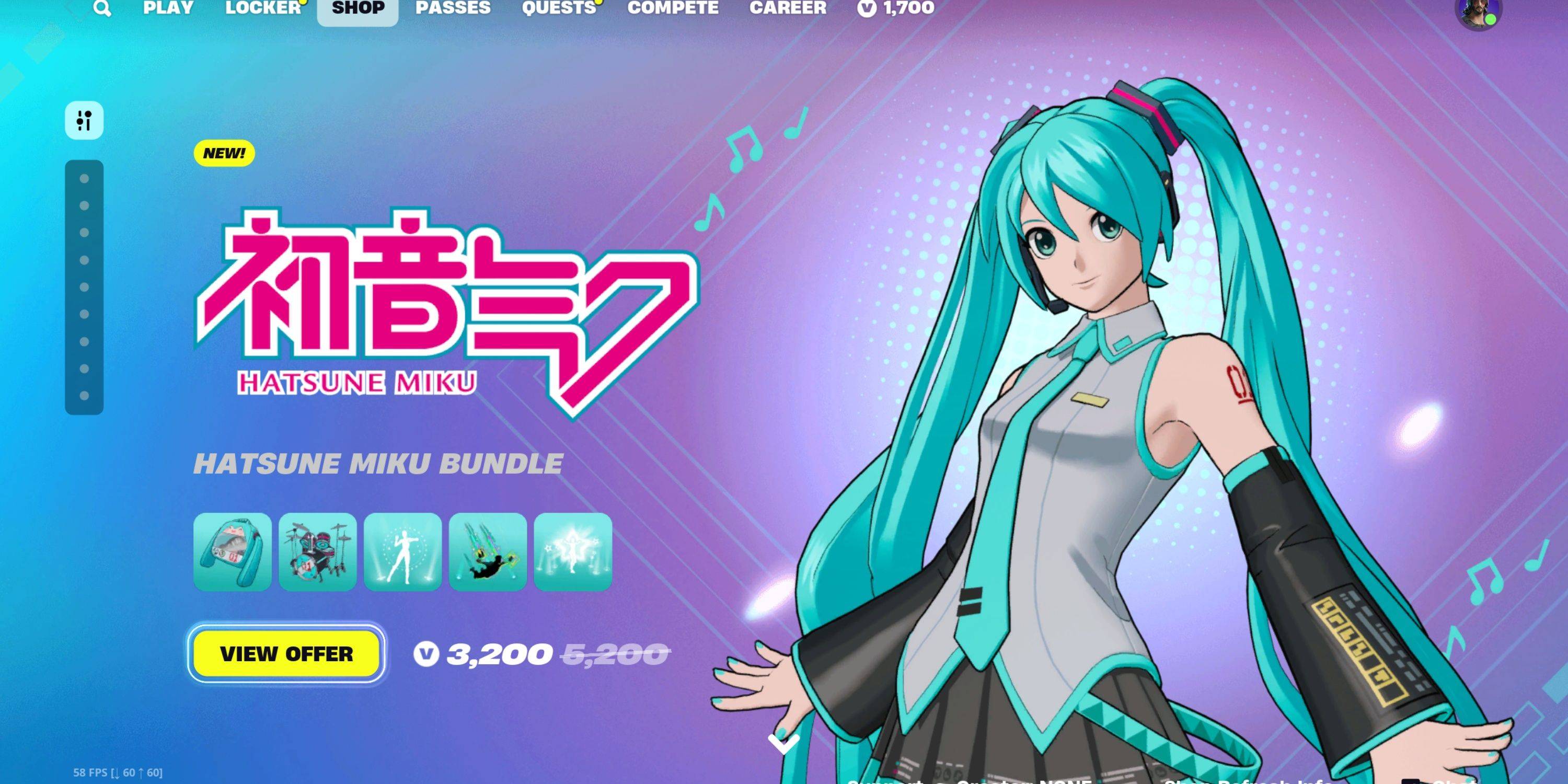 - 3,200 V-Bucksバンドル(9項目):このバンドルは、衣装を網羅し、バックブリング、ミクライブ、ミクミクビームエモット、ミクライトコメント、ミクのビートドラム、ハチミuマイク、ミクジャムトラック。