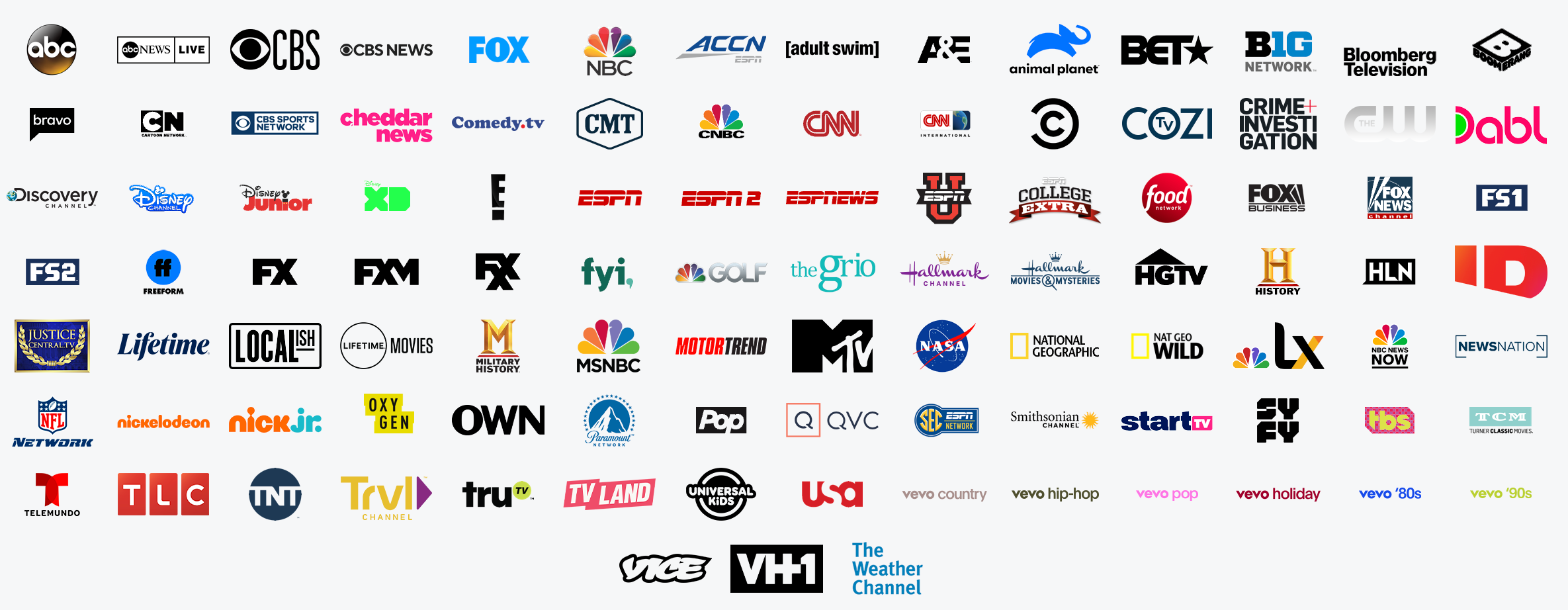 Hulu + Live TVは、ABC、CBS、Fox、NBCのローカルネットワークアフィリエイトやニュースを含む95以上のチャネルを提供しています。また、コメディセントラル、ESPN、FX、フードネットワーク、ディズニーチャンネル、HGTV、歴史チャンネル、ID、ライフタイム、MTV、NFLネットワーク、ニコロデオン、パラマウントネットワークなどの人気のあるチャンネルも備えています。