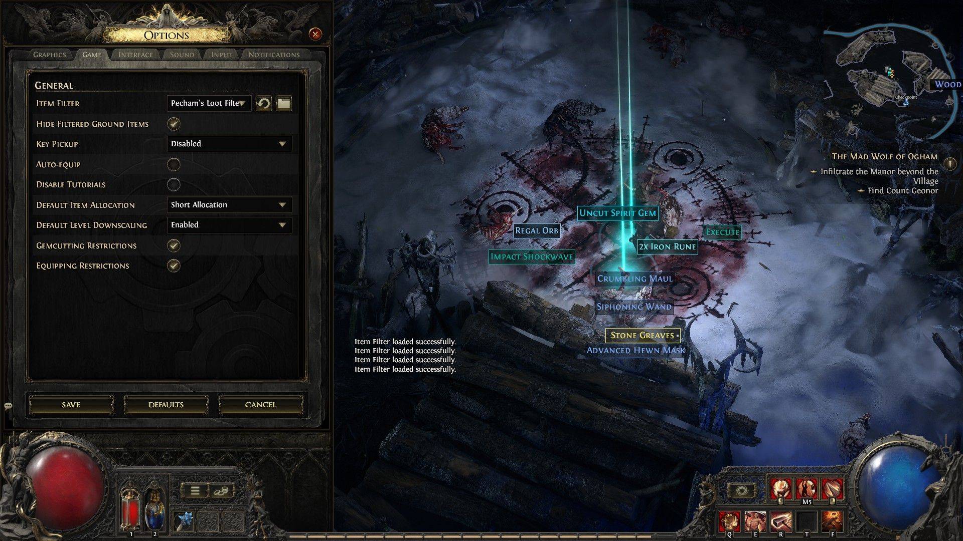 フィルターが続き、ゲームを起動します。 [オプション]メニュー、[ゲーム]タブに移動します。 「アイテムフィルター」ドロップダウンメニューからフォローフィルターを選択し、変更を保存します。ゲーム内のアイテムドロップは、個別のラベル、色、またはサウンドを使用して、フィルターの設定によって分類されます。