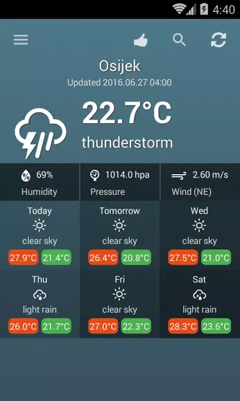 Stay one step ahead of Croatia's ever-changing weather patterns with the Weather Croatia app. Whether you're in bustling Zagreb, sunny Split, coastal Rijeka, or historic Osijek, this app provides precise weather forecasts for over 50 locations across the nation. Its user-friendly interface allows you to effortlessly access detailed data on high and low temperatures, wind speeds, cloud cover, and humidity levels. Additionally, the app employs a color-coded system to instantly convey current weather conditions. Don't let rain or chilly weather catch you off guard—download the app today and stay prepared for any weather scenario!