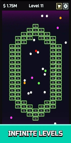 游戏拥有丰富的升级系统。每通过一个关卡,您都会积累金钱来升级各种能力指标。您可以购买更多球,提高它们的移动速度,并增强它们的威力。每种类型的球都有其优点和缺点。有些球可能有毒性,可以腐蚀砖块,而另一些球则具有自动瞄准功能。此外,游戏还提供可以提升速度的增强道具,帮助球在短时间内击碎许多砖块。